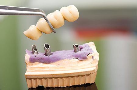 Las rehabilitaciones sobre implantes dentales se componen de dos elementos: el implante dentario (no visible, fijado al hueso) y la corona (parte visible que ejerce la función masticatoria).